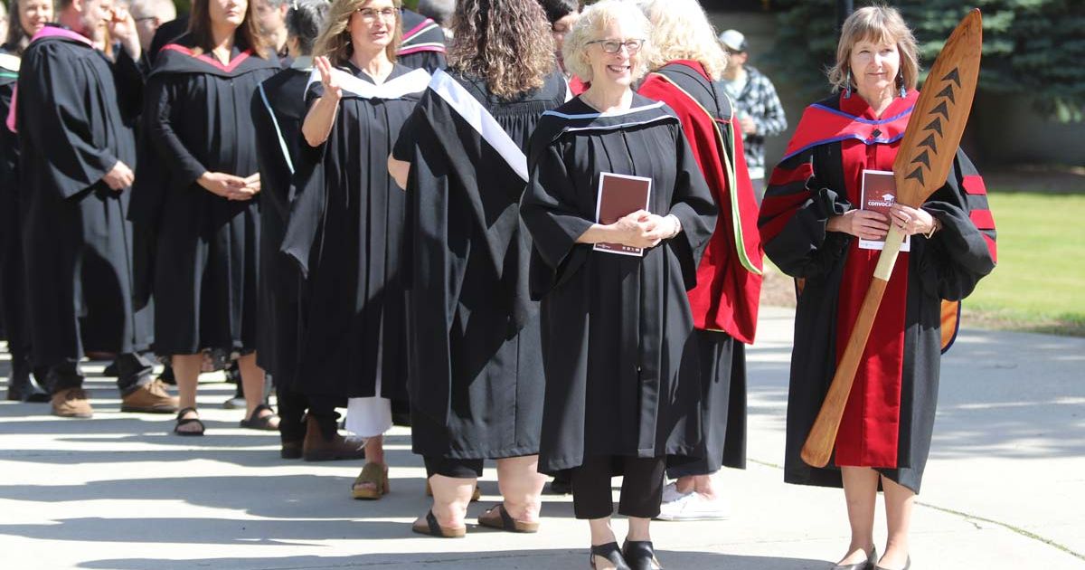 President Maggie Matear and Board Chair Margaret Sutherland stand outside at convocation wearing black robes