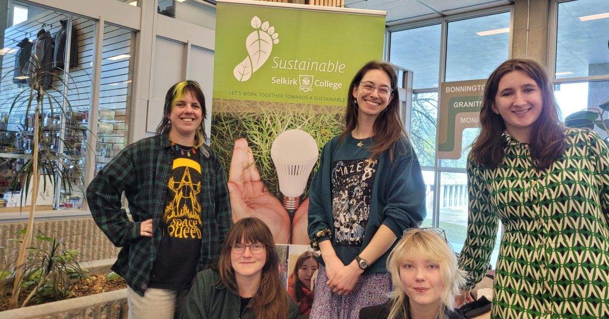 Four female Selkirk College students stand smiling before a Sustainable Selkirk banner