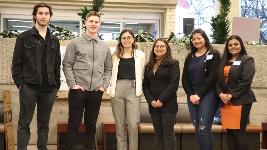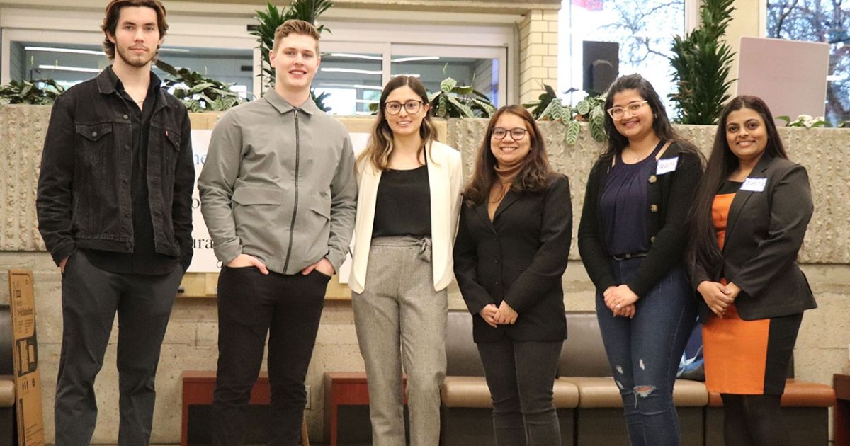 Winners of the in-person Business Plan Tradeshow Competition standing proud after hearing the results. (Left to right) Connor Amonson and Kaleb Comishin (second place), Mariana Martin and Christine Joy Esplana (first place) and Ankita Nair and Asmita Joge (honourable mention).