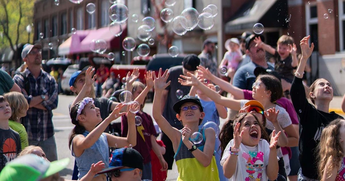 Children chasing bubbles in Trail, the image that is in the 2023 Snapshot cover page