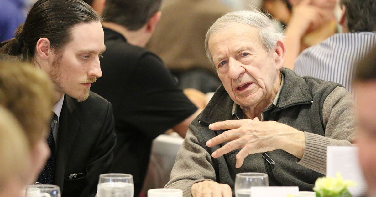 Selkirk College alumnus Darren Paterson (left) at the Bursary Tea in 2016 where he received financial support from community donors. Now a PhD student at York University, Paterson has started a bursary of his own to support future Selkirk College learners.