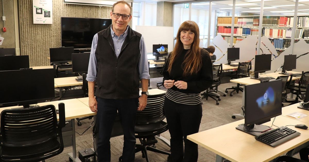 PHOTO CUTLINE: Selkirk College librarians Gregg Currie (left) and Sarah James (right) have been welcoming students to dive deeper into their studies in the new computer lab on the Castlegar Campus. Made possible through funding from Columbia Basin Trust, the lab provides both an important service and an opportunity to teach students the importance of information literacy.