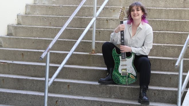 Class of 2024 co-valedictorian Jay Porteous sits on steps with her guitar.